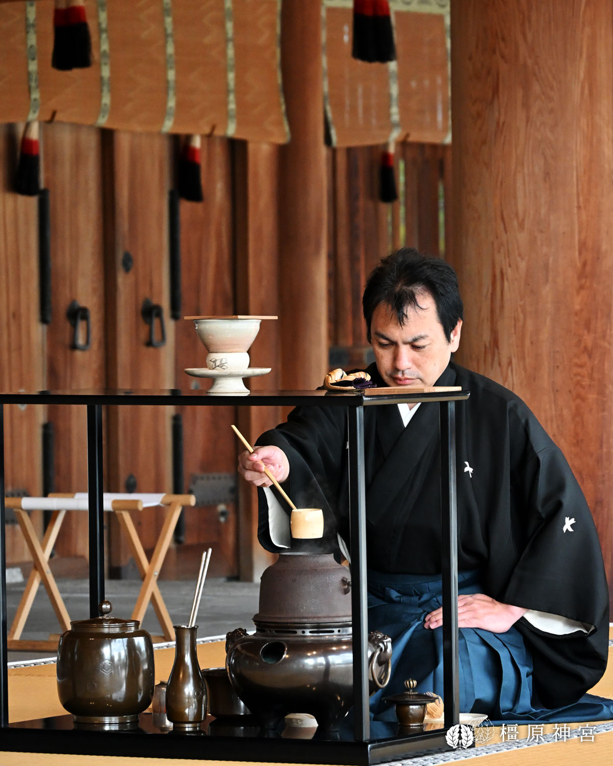 祭典は石州流関係者の参列のもと執り行われ、斎主の祝詞奏上に続いて、十七代茶道石州流宗家家元 片桐貞明宗匠の奉仕により御祭神二座分のお茶が点じられました。