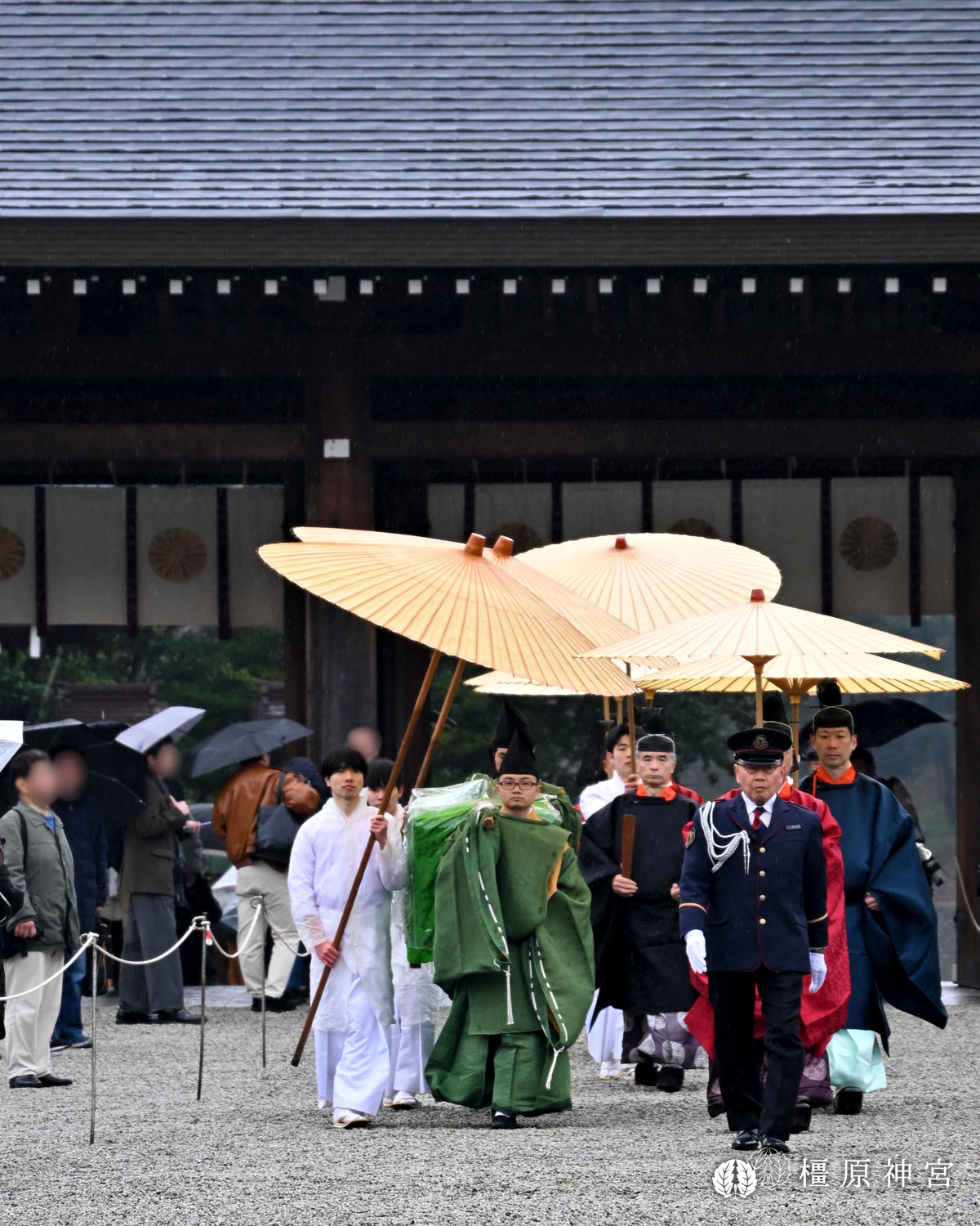また、紀元祭は「勅祭」にあたり、勅使が参向し天皇陛下からのお供え(幣帛)が御神前に供えられます。